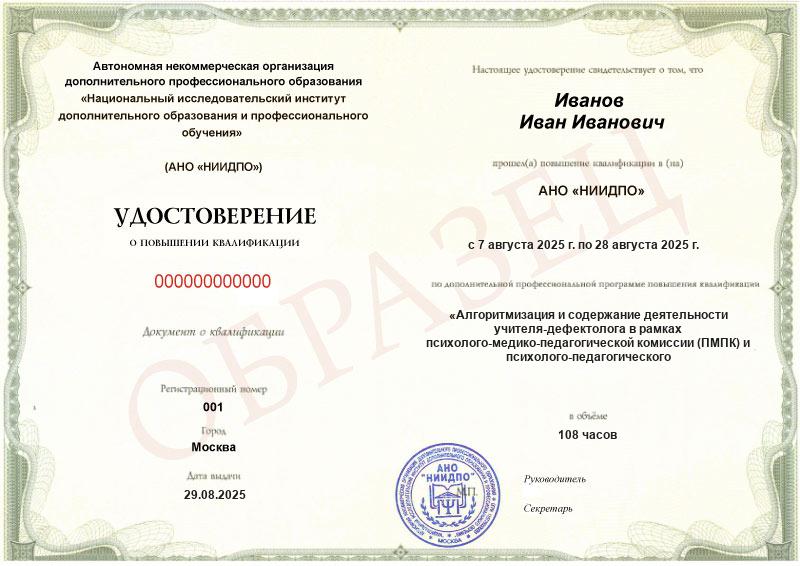 Алгоритмизация и содержание деятельности учителя-дефектолога в рамках психолого-медико-педагогической комиссии (ПМПК) и психолого-педагогического консилиума (ППк) (108ч)