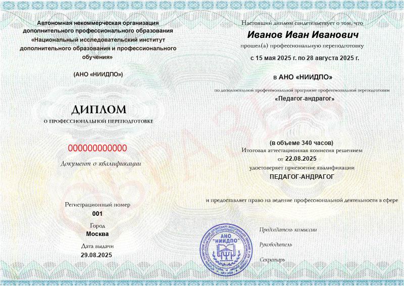 Да, документы оформляются на бланках с защитой от подделок, заполняются на русском языке, в них ставится печать АНО «НИИДПО».