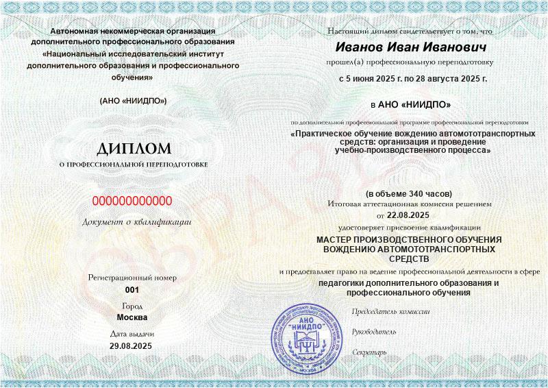 - Квалификация: Мастер производственного обучения вождению автомототранспортных средств