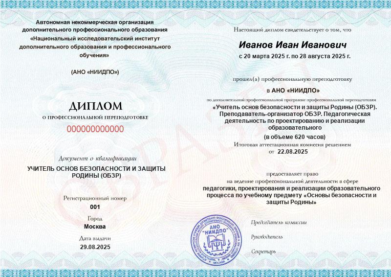 • 2 квалификации: УЧИТЕЛЬ ОСНОВ БЕЗОПАСНОСТИ И ЗАЩИТЫ РОДИНЫ (ОБЗР) + ПРЕПОДАВАТЕЛЬ-ОРГАНИЗАТОР ОБЗР