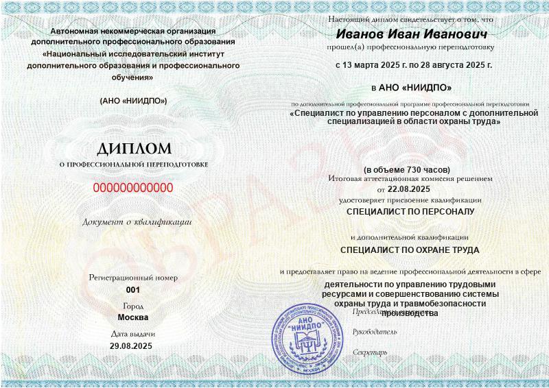 На курсе вы получите диплом  о профессиональной переподготовке с присвоением сразу двух квалификаций: Специалист по управлению персоналом и Специалист по охране труда.