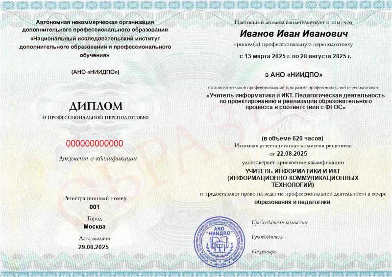Студент, желающий поступить в АНО «НИИДПО», должен предоставить справку из образовательной организации. Независимо от срока окончания обучения по программе дополнительного образования, диплом о профпереподготовке выдаётся только после предъявления документа о получении среднего профессионального или высшего образования.